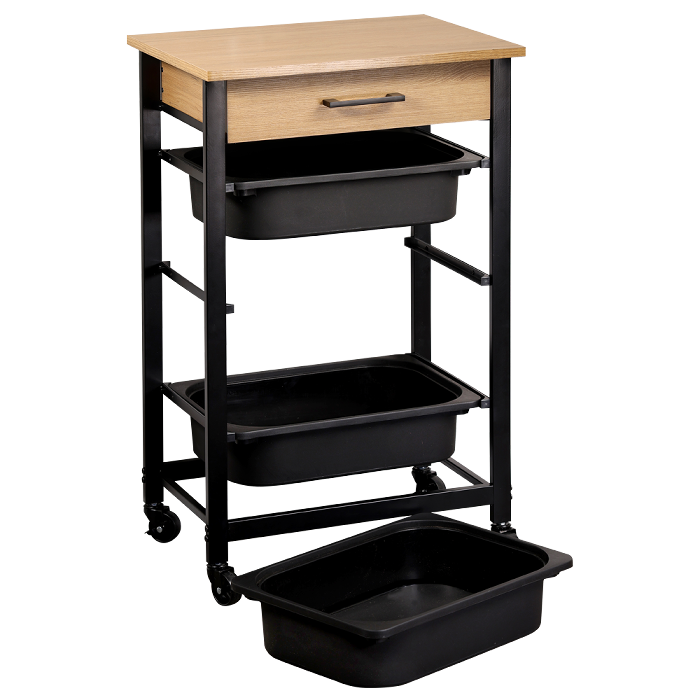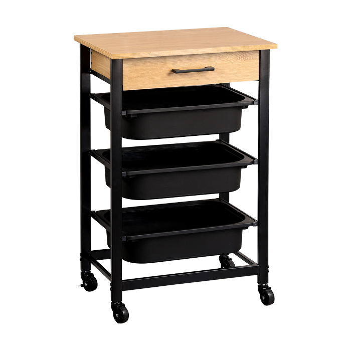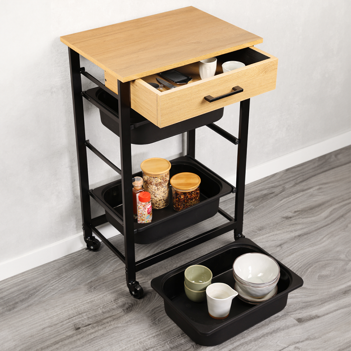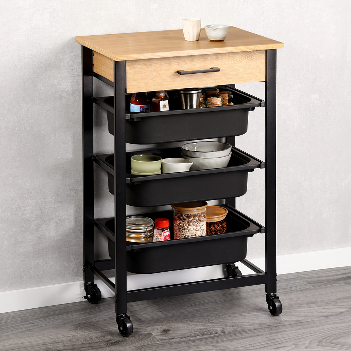Viel Stauraum: Küchenwagen mit 3 herausnehmbaren Kunststoffbehältern und 1 Schublade – ideal für Vorräte, Geschirr oder Küchenzubehör.
