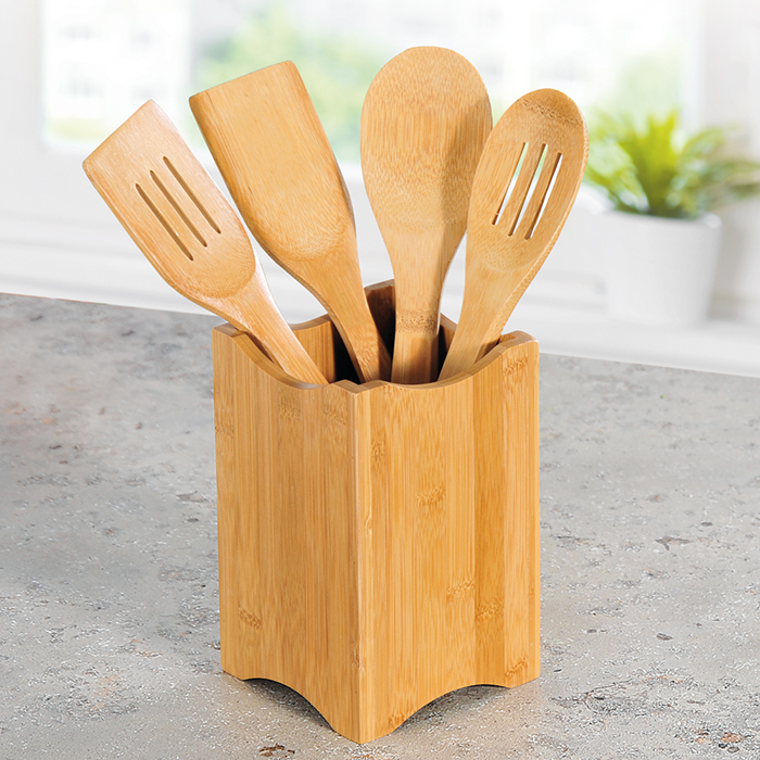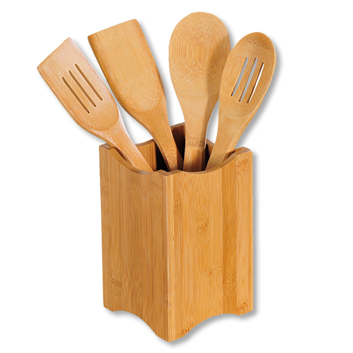 Set of 1 cutlery stand, 1 spatula with slot, 1 spatula and 2 spoons