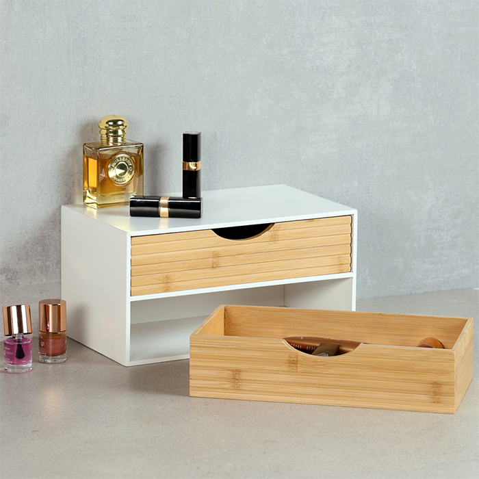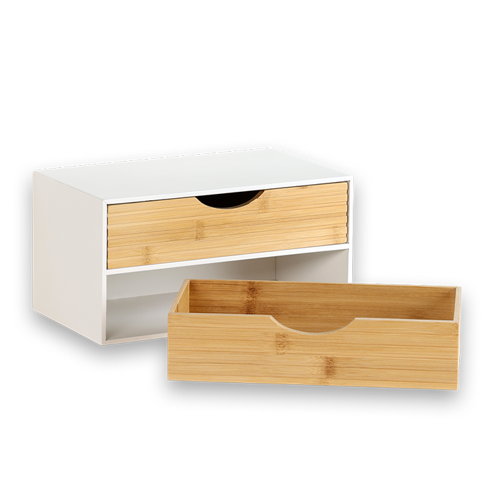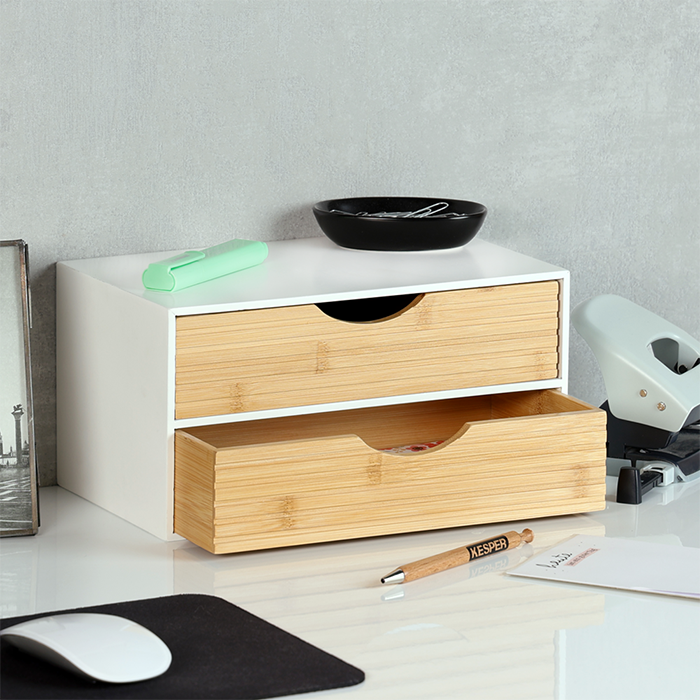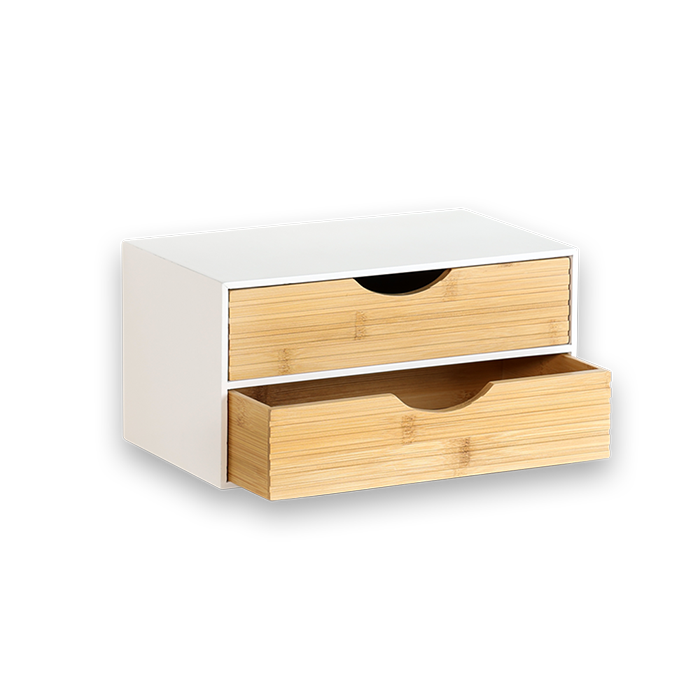 The KESPER Organizer 58962 impresses with its clear design and functional layout. Measuring 27 x 16 x 14 cm, it offers a space-saving solution for storing office supplies, cosmetics, accessories, or small everyday items. The two drawers, each 9 cm deep, ensure clear organization, while the ribbed bamboo fronts give the organizer a warm, modern look. The white body provides a calm contrast and blends harmoniously into various interior styles. The material used is FSC® certified (FSC® C014021).