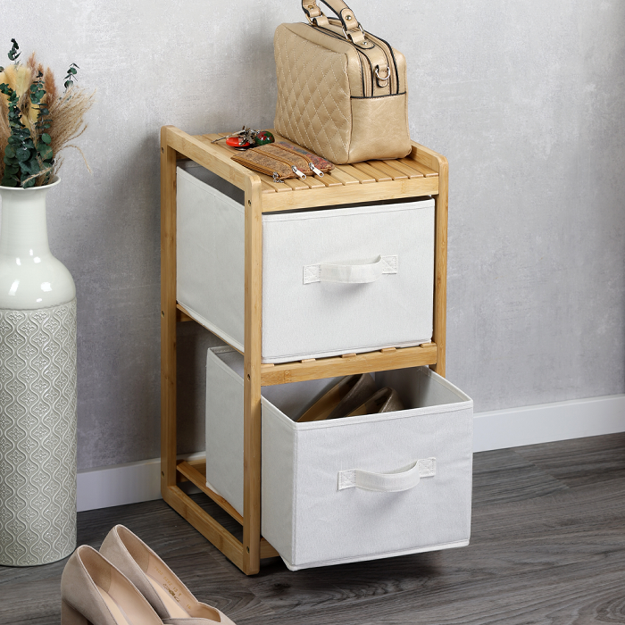 The KESPER shelf with 2 boxes (item no. 54275) offers a functional and stylish solution for everyday organization. Measuring 29.5 x 33.5 x 57 cm, it fits perfectly in smaller spaces and creates extra storage where it's needed. The sturdy bamboo frame lends a warm, inviting look, while the white fabric boxes with handles keep things tidy and organized. Each box measures 26 x 33 cm and is 21 cm high, with a maximum load capacity of 3 kg. The bamboo used is FSC® certified (FSC® C014021).