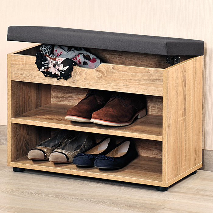 Maximum storage space for minimum space. The KESPER® shoe cabinet made of 100% FSC®-certified chipboard declares war on your lack of space. It creates space for up to 6 pairs of shoes, which you can organise flexibly. If you can't fill the shoe cabinet completely with your favourite pairs, it is also ideal for storing other items such as games, books, handbags etc, handbags etc. The grey seat cushion also provides a practical seat where you can sit down to put on your shoes. When you open the seat, you will find another compartment that you can use to store everyday items such as keys, wallets, scarves, hats or gloves (and much more). or gloves (and much more). This space-saving all-rounder with an attractive design not only provides you with more space and storage space but also an even cosier home. With the KESPER® shoe cabinet with cushion is always the right choice!